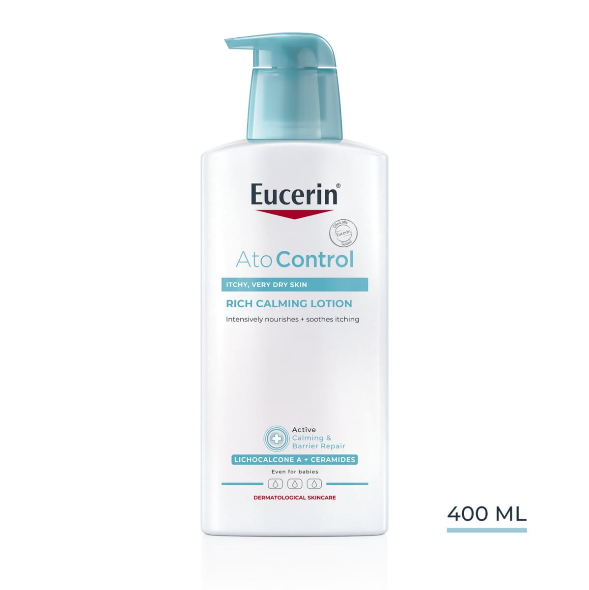Eucerin AtoControl Rich Calming Lotion on erityisesti päivittäiseen käyttöön kehitetty kevyt vartalovoide, joka rauhoittaa ja kosteuttaa tehokkaasti ärtynyttä ja kutisevaa ihoa. Sen helposti imeytyvä vesi öljyssä -koostumus sisältää Licochalcone A:ta, keramideja ja omega-öljyjä, jotka vahvistavat ihon luonnollista suojaa, lievittävät kuivuutta ja kutinaa sekä pidentävät oireettomia jaksoja pahenemisvaiheiden välillä.