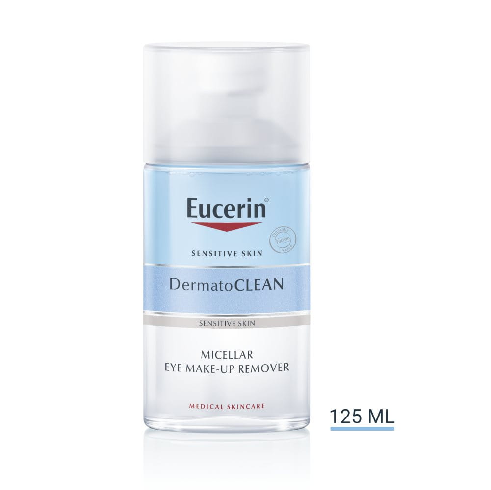 Eucerin DermatoCLEAN Eye Make-Up Remover -silmämeikinpuhdistusaineella puhdistat silmämeikin ja muut päivän aikana ihollesi kertyneet epäpuhtaudet herkältä silmänympärysiholta. Puhdista kasvot valitsemallasi Eucerin-ihonpuhdistustuotteella: Eucerin DermatoCLEAN 3 in 1 Micellar Cleansing Fluid (kaikille ihotyypeille) Eucerin DermatoCLEAN Cleansing Gel (normaalille ja sekaiholle) Eucerin DermatoCLEAN Mild Cleansing Milk (kuivalle iholle)