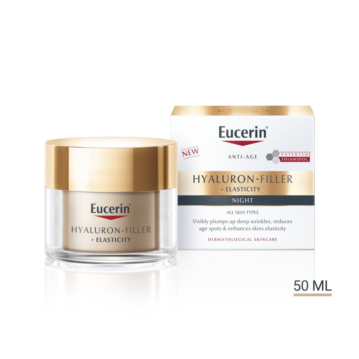 Sen ainutlaatuinen koostumus ehkäisee ikääntymisen merkkejä monipuolisesti. Eucerinin innovatiivinen yhdistelmä suuri- ja pienimolekyylistä hyaluronihappoa silottaa näkyvästi syvimpiäkin ryppyjä. Lisäksi uusi Collagen-Elastin Complex, joka sisältää arktiinin ja kreatiinin, tehostaa kollageenin tuotantoa ja lisää ihon kimmoisuutta. Voiteen tehoa täydentää patentoitu Thiamidol, jonka kliiniset testit ovat osoittaneet vaalentavan pigmenttimuutoksia näkyvästi jo kahden viikon säännöllisen käytön jälkeen.