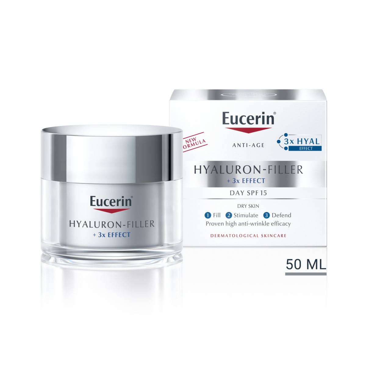 Eucerin Hyaluron-Filler Day SPF15 -päivävoide sopii erityisesti kuivalle iholle. Se ehkäisee ensimmäisiä ikääntymisen merkkejä, sillä voide täyttää hienot juonteet ja jopa syvimmät rypyt. Lisäksi Eucerin Hyaluron-Filler Day SPF15 -päivävoide ehkäisee tehokkaasti UV-säteilyn aiheuttamaa valosta johtuvaa ikääntymistä sekä suojaa ihoa vapailta radikaaleilta.