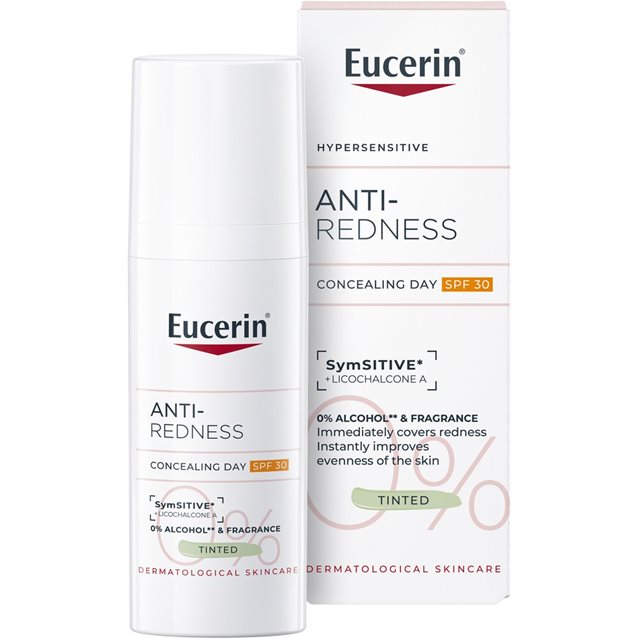 Eucerin AntiREDNESS Concealing Day Care SPF 30 on kehitetty erityisesti erittäin herkälle ja ruusufinniin tai couperosaan taipuvaiselle iholle. Voide levitetään kasvojen iholle puhdistuksen jälkeen. Se lievittää ärsytystä ja peittää iholla näkyvän punoituksen. Innovatiivisessa koostumuksessa yhdistyvät kaksi vaikuttavaa ainesosaa, SymSitive® ja Licochalcone A.