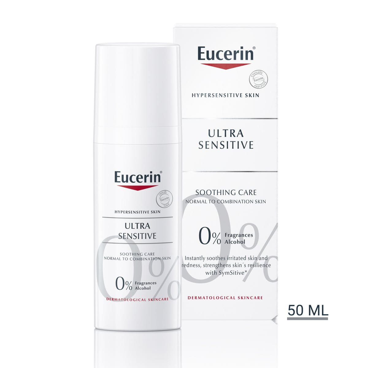 Normaalille ja sekaiholle tarkoitetun Eucerin UltraSENSITIVE Soothing Care -voiteen koostumus on kevyt. Se sisältää SymSitive®-ainesosaa, joka on innovatiivinen, erittäin herkälle iholle kehitetty vaikuttava ainesosa. SymSitive® säätelee herkkää ihoa tehokkaasti juuri hyperreaktiivisuuden alkujuurilla.