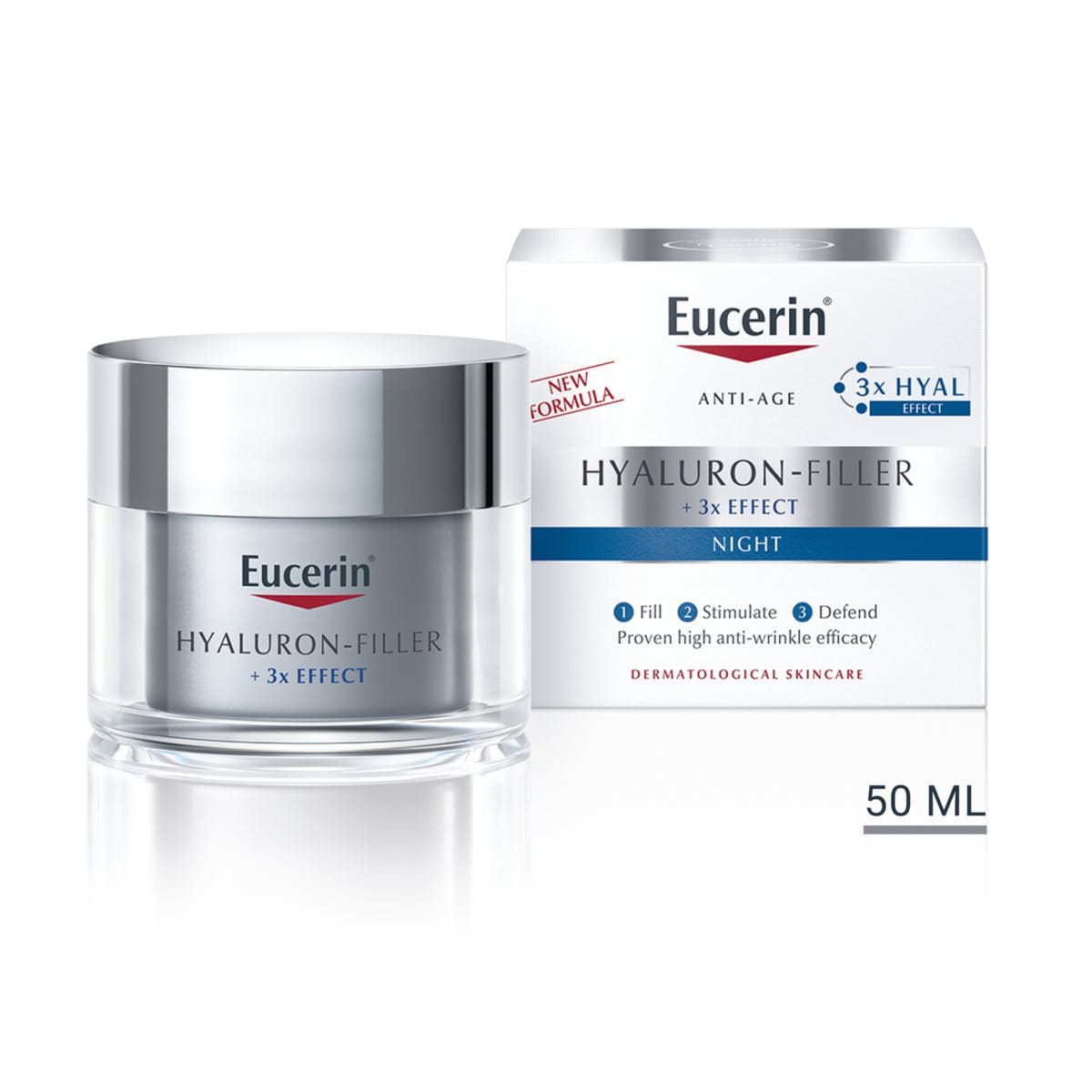 Eucerin Hyaluron-Filler Night -yövoide sopii kaikille ihotyypeille. Se ehkäisee ensimmäisiä ikääntymisen merkkejä, sillä voide täyttää hienot juonteet ja jopa syvimmät rypyt. Tuote sisältää korkean ja pienen molekyylipainon omaavaa hyaluronihappoa, glysiini-saponiinia ja enoksolonia. Ne yhdessä täyttävät tehokkaasti syvimpiäkin ryppyjä. Suurimolekyylinen hyaluronihappo parantaa kosteuspitoisuutta ja tasoittaa ihon uloimpia kerroksia, kun taas pienimolekyylinen hyaluronihappo kulkeutuu orvaskeden kerroksiin – eli sinne, jossa syvemmät rypyt syntyvät. Enoksoloni suojaa ihon omaa hyaluronia hajoamiselta.