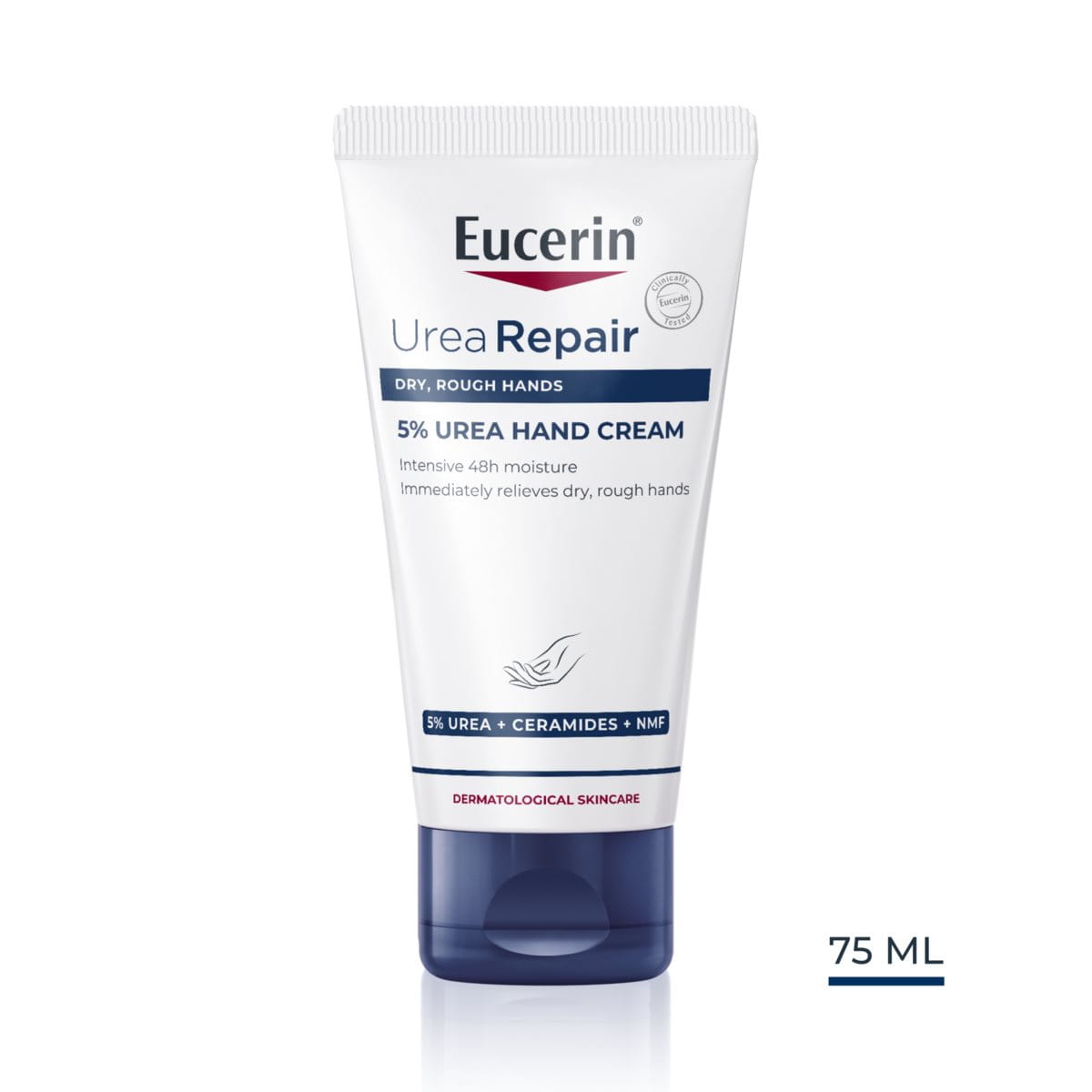 Juuri kuivalle käsien iholle kehitetty käsivoiteemme imeytyy helposti, ei jätä öljyistä pintaa ja sisältää tasapainoisen yhdistelmän ainesosia, jotka estävät kosteuden haihtumista iholta. Eucerin UreaRepair PLUS 5% Urea Hand Cream tuo kuivalle käsien iholle välittömän ja 48 tuntia vaikuttavan hyvänolontunteen. Se rauhoittaa punoitusta ja silottaa karheaa ihoa ja pitää kädet pehmeinä ja kosteutettuina silloinkin, kun niitä on tarpeen pestä usein.